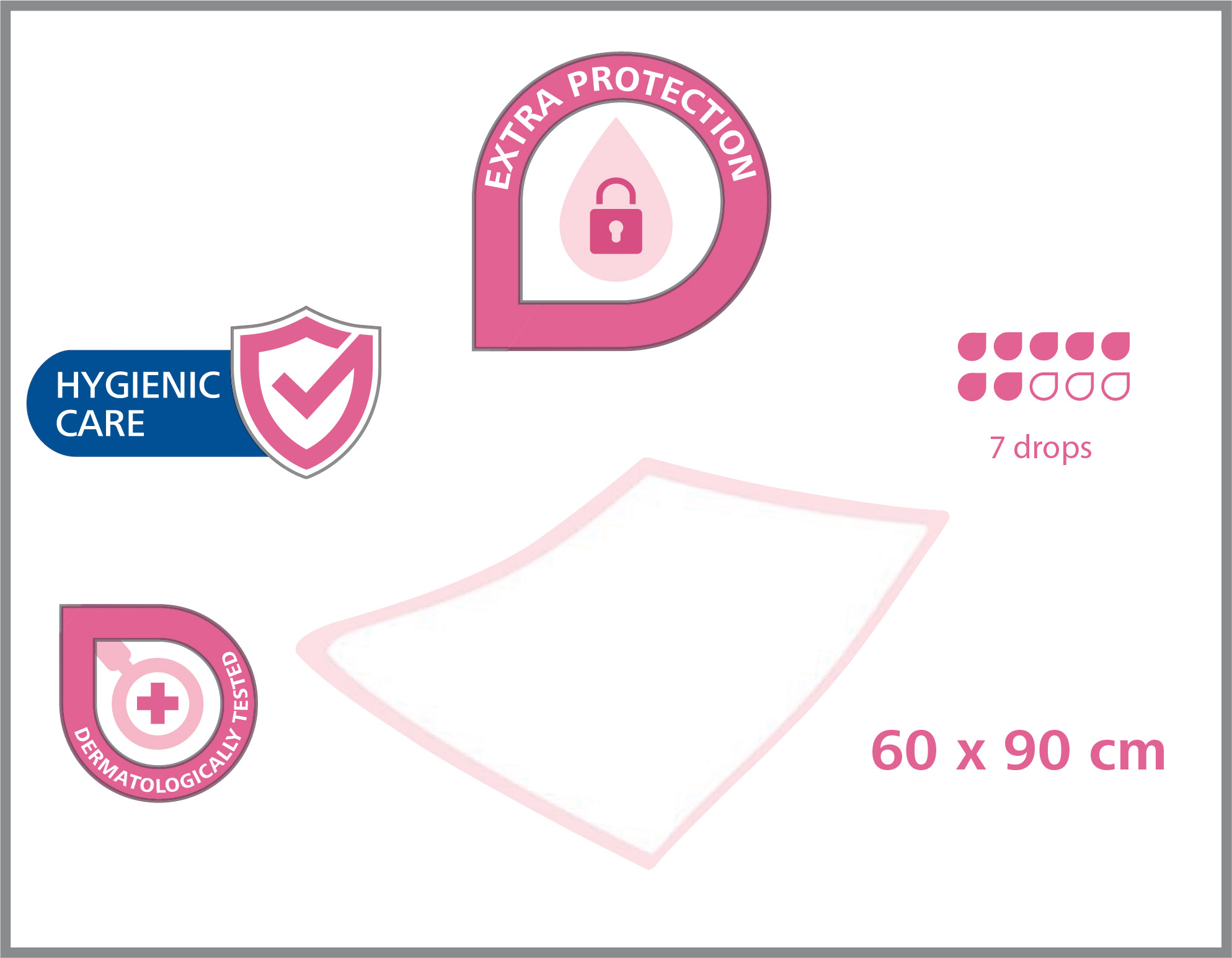 - Disposable bed mat with an absorbent core made of cellulose fluff providing hygienic care and extra protection.