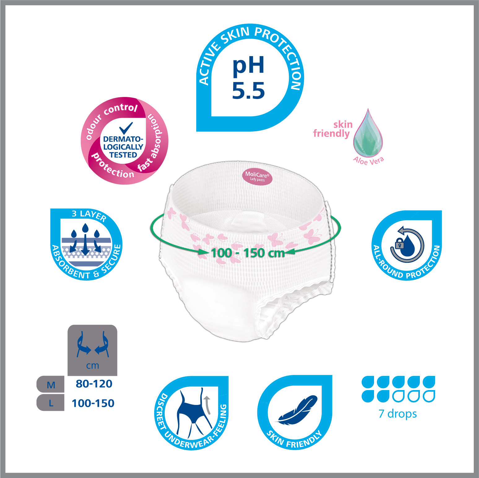Features: Skin-friendly, pH5.5 ensures maximum skin compatibility Soft top sheet treated with Aloe Vera Breathable textile-like back sheet and soft top sheet Used for highly dependent or bedridden patients or residents Waist: 100-150 cm.