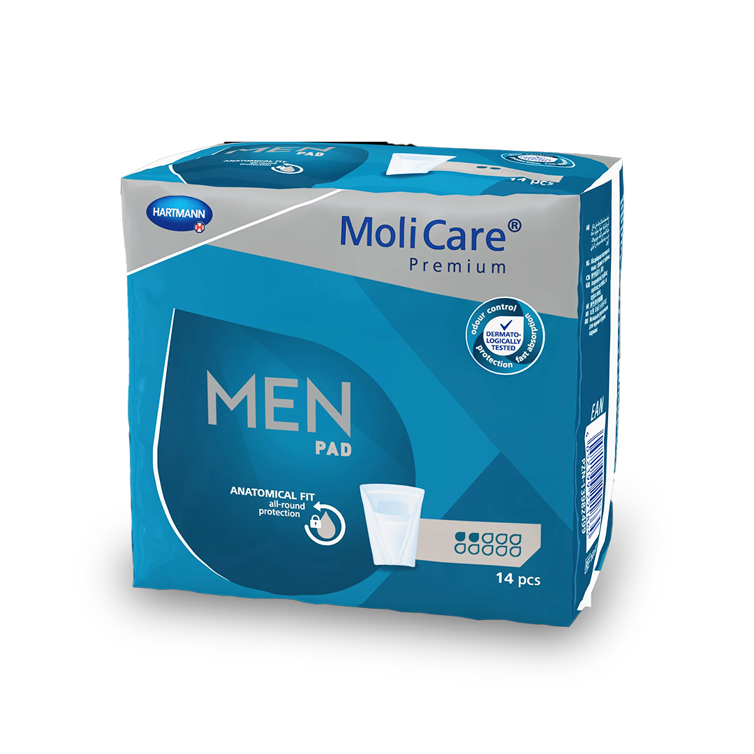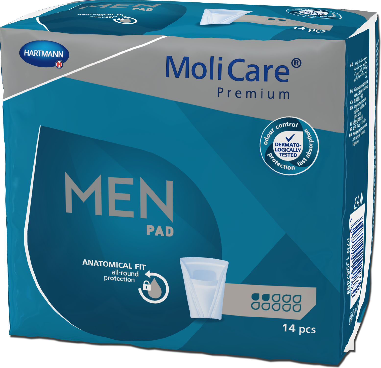 Product details Bladder weakness in men may occur from an overactive bladder, or a weakened pelvic floor, and requires purpose designed incontinence products to suit the male anatomy. MoliCare® Premium MEN Pads support men to deal with bladder leakages. Whether suffering from stress incontinence or urge incontinence, this product is simply placed in your underwear, fixed with an adhesive strip, for an always discreet, easy and quick incontinence solution on the go. MoliCare®
