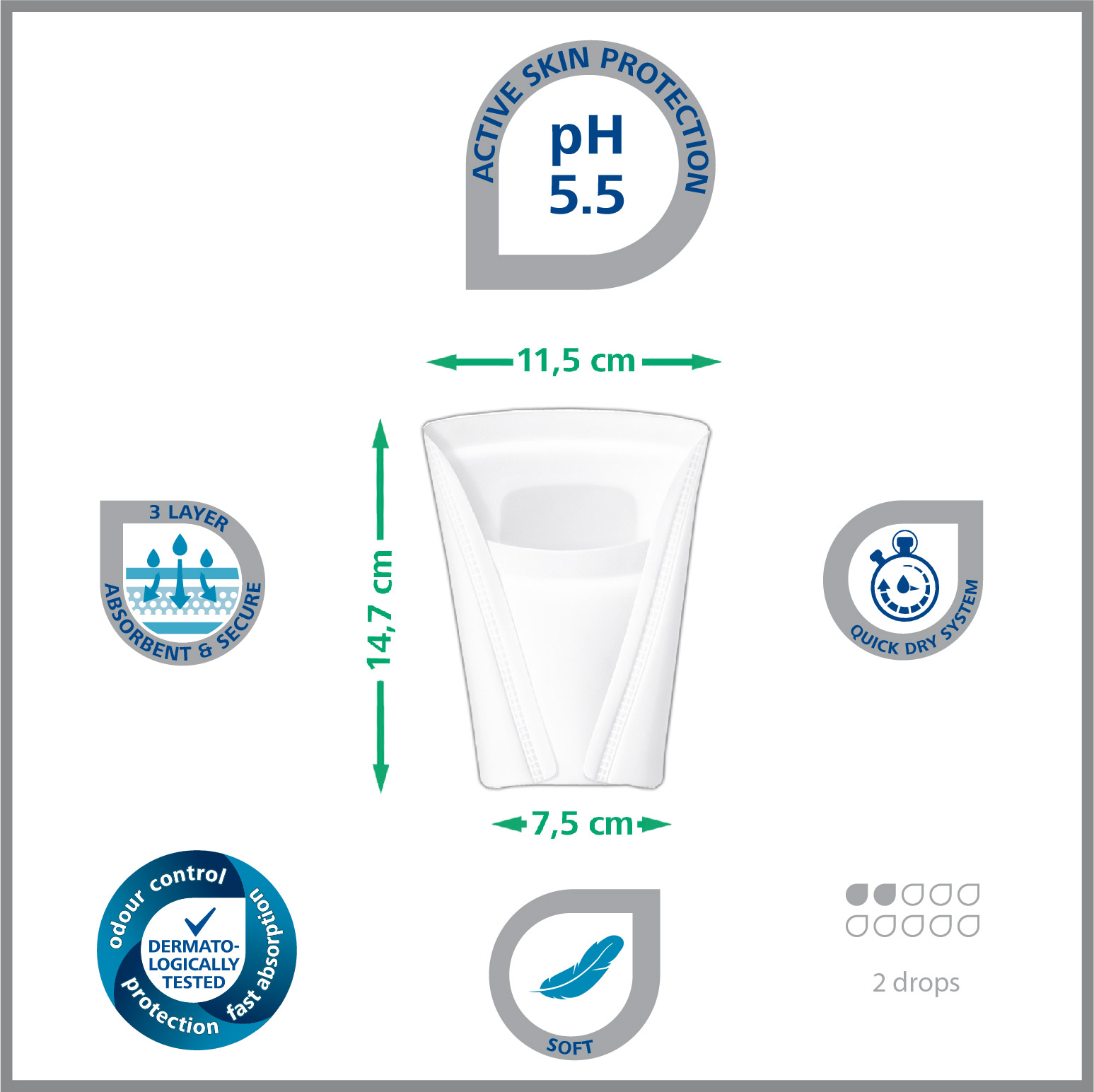 - Discreet comfort with soft, cotton-like materials and odour neutralizer