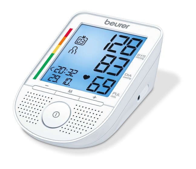 The fully automatic BM 49 upper arm blood pressure monitor from Beurer with handy voice output allows you to have the values read out in your language. Measure your blood pressure quickly and easily. The measured values are stored, and both the development and the average of the measured values can be displayed. You are also warned of possible existing cardiac arrhythmia. The recorded values are classified on a colored scale and assessed graphically.