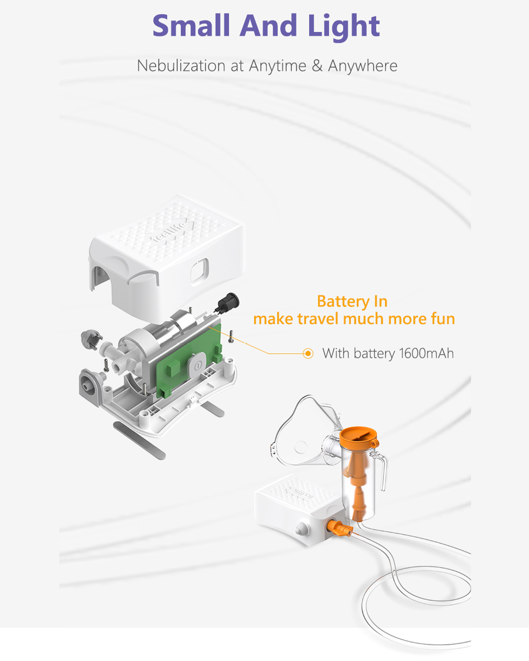 - Dual using battery or power supply for peace of mind, with 1600mAh battery, it is easy nebulization anytime, anywhere.