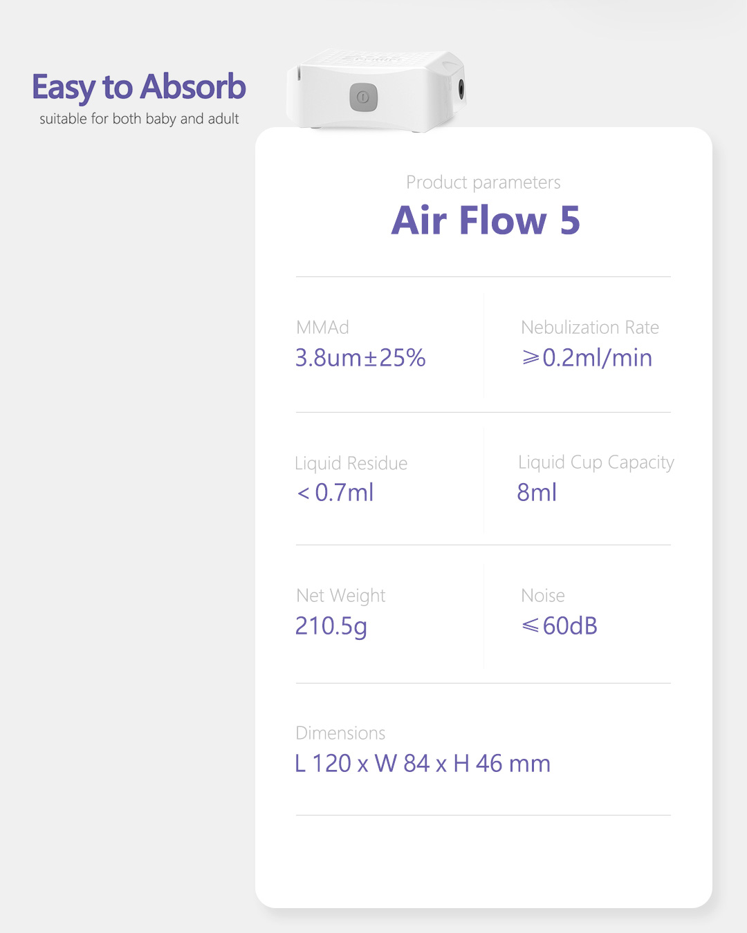 The Feellife Air Flow 5 stands out with its superior nebulization capabilities, ensuring medication reaches deep into the lungs where it’s needed most:
