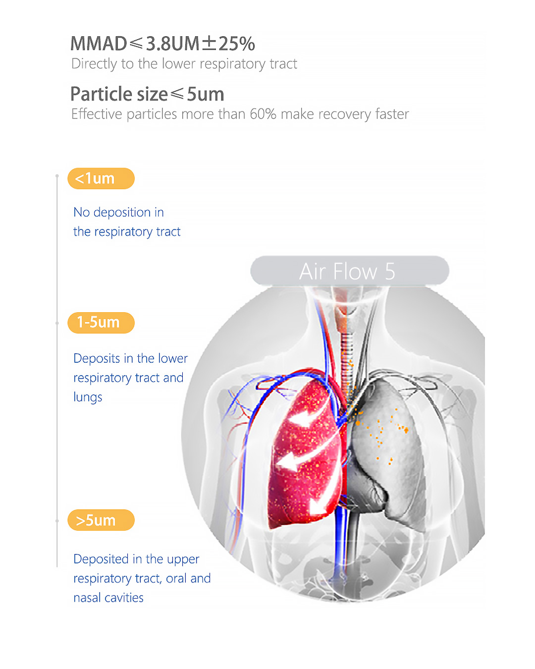- Particle Size (MMAD): 3.8μm ± 25% (Effective particles < 5μm account for 60%)
