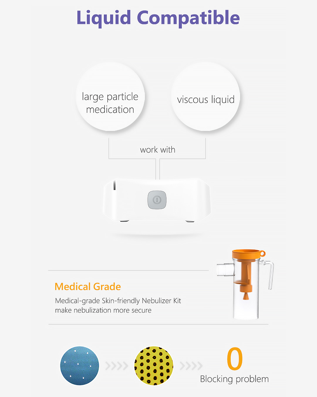 - Exceptional Liquid Compatibility: Thanks to its precise nebulized particle size (3.8μm with minimal error), this device excels in nebulizing a wide range of medications, including large particle drugs and viscous liquids, without blocking the holes. This versatility ensures you can use the prescribed medication without hassle.