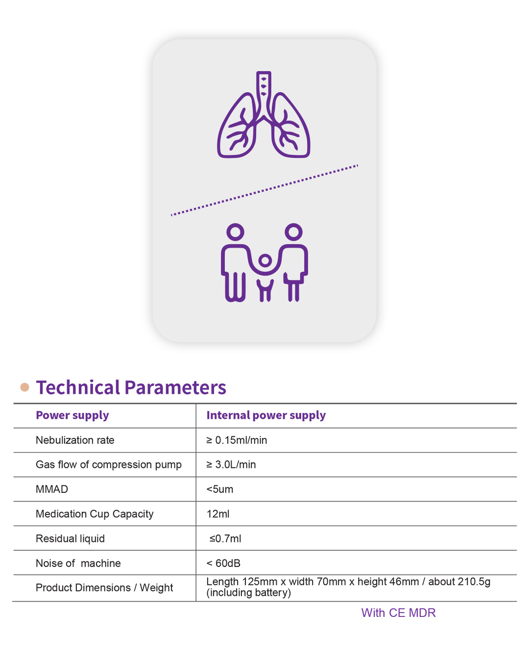 - Nebulized particle size is 3.8μm, the error does not exceed 25% without blocking holes easy to be nebulized large particles of drugs and viscous liquids.