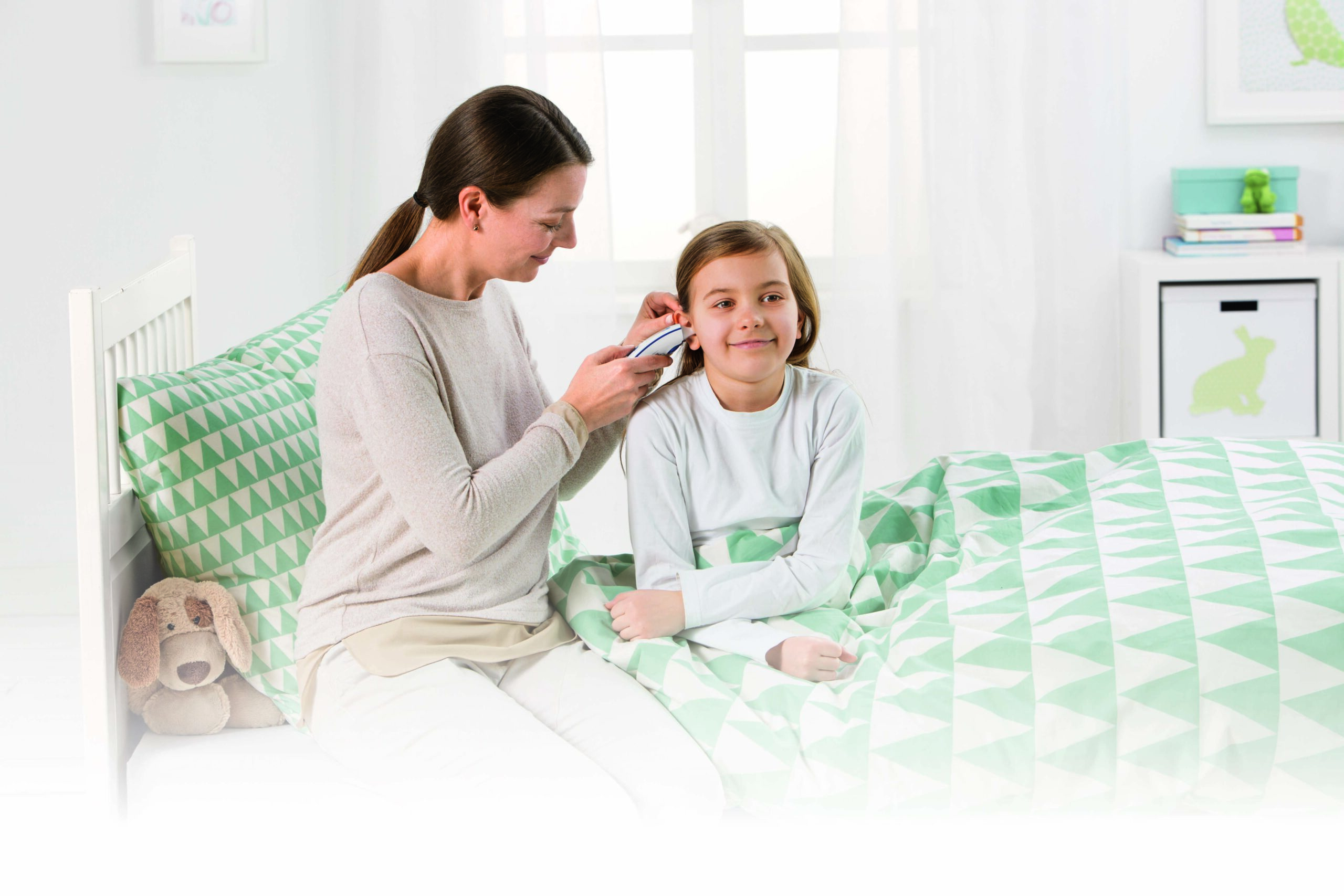 - Ideal for families with children 2 methods of measurement: in the ear and on the forehead. Fast infrared reading in 1 second. Easy to use. Measurement with sound. Robust and reliable use. Hygienic thanks to the 10 single-use caps included 10 memory locations. With practical protective case. Additional single-use caps available.