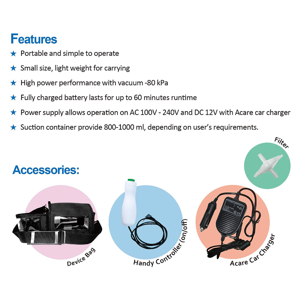 Model: ASU-200 / Acare Portable Suction Unit is a reliable portable device. It is suitable for hospital, clinic, ambulance and outdoor for patient to draw out sputum. ASU-200 portable suction unit can operate for an hour at disconnected from power supply. It is made for convenient use.