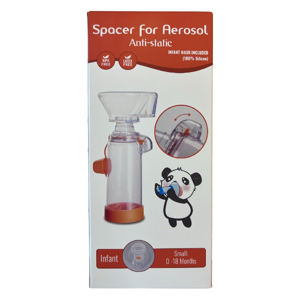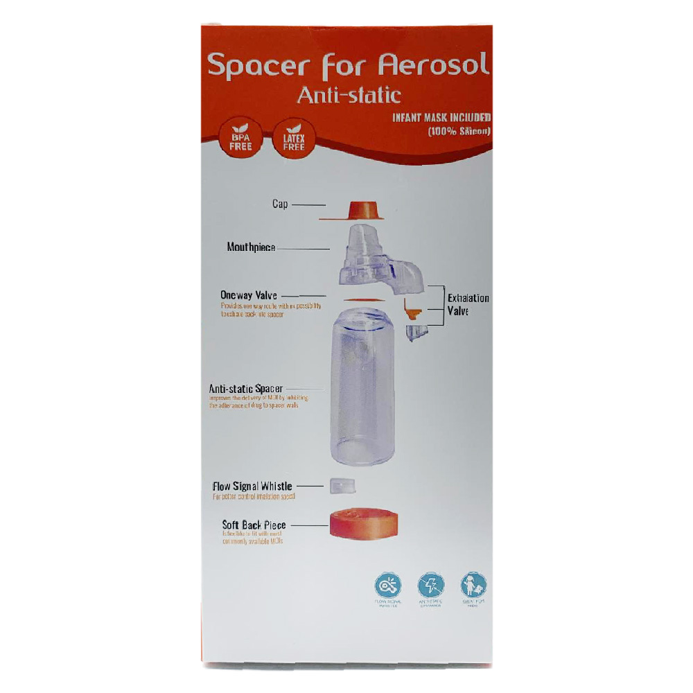 Spacer for Aerosol Anti-Static with soft 100% Silicon Mask for Infant (0-18 month). Antistatic-BPA Free-Latex free-flow Signal Whistle with Exhalation Valve: it moves as your baby breathes in to ensure correct use for medication delivery.