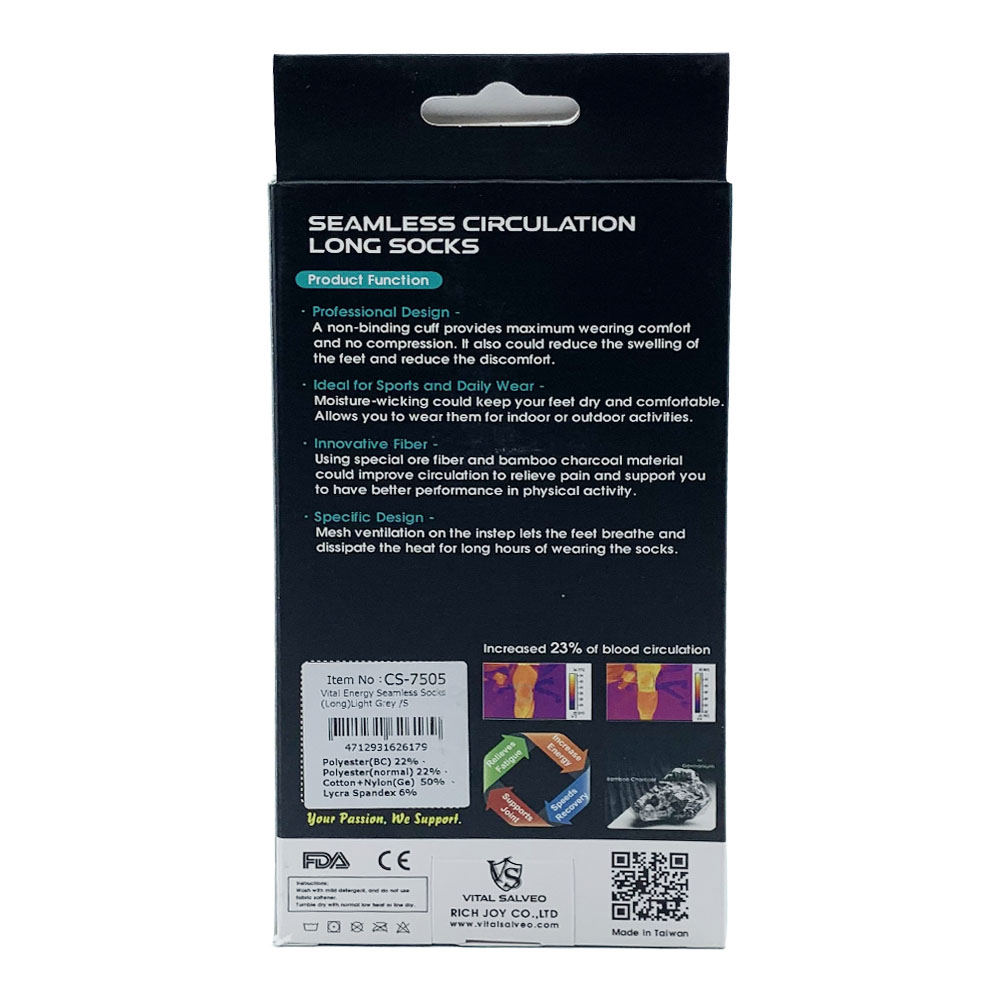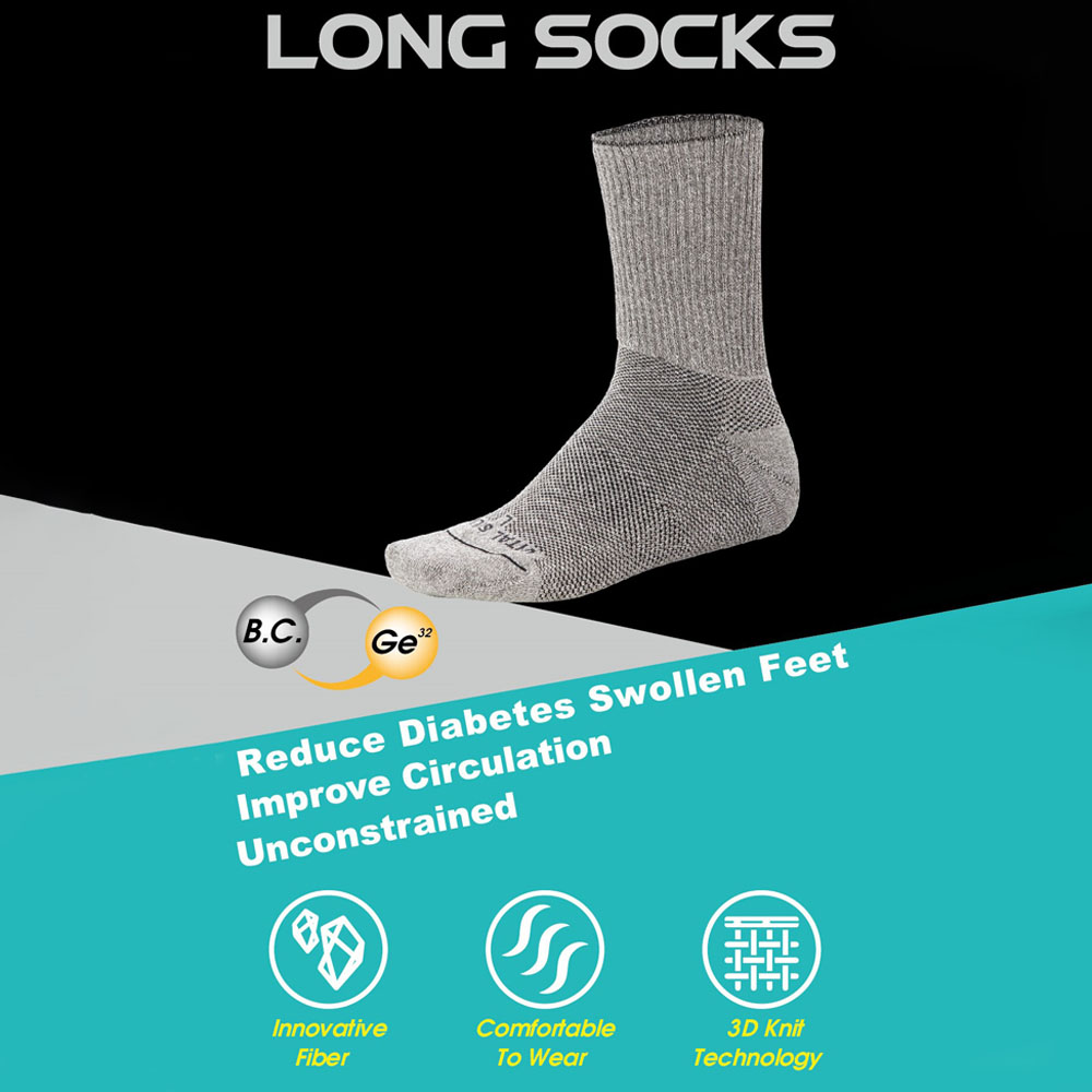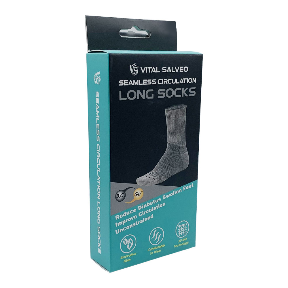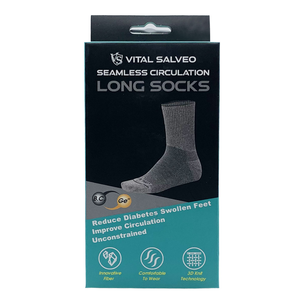 Vital Salveo Seamless Diabetic Socks Long: With Germanium + Bamboo Charcoal yarn with high-density weaving technique for extreme softness, comfort, and mobility. Soft brace with no restraining compression – suitable for diabetic or people with circulation issues, and seeking for comfortable wearing in socks. Seamless sock top weaving allows better breathing and assists with circulation and heat regulation.