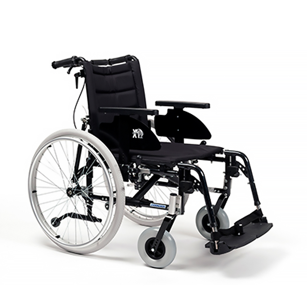 Lightweight aluminum wheelchair with a reclining backrest of 30°, reinforced cross and Quick release wheels. Standard equipped with short armrests for easy table access.