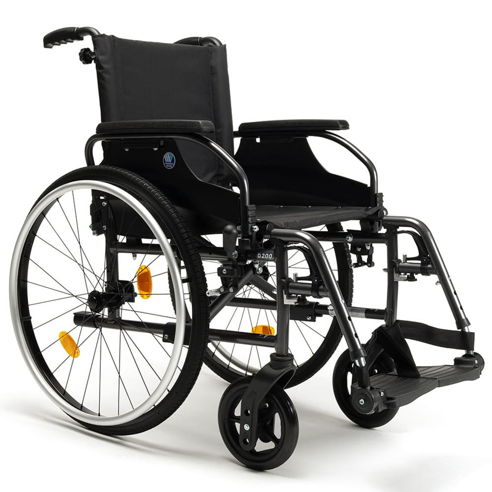 The D200 is your ideal hybrid lightweight aluminum wheelchair. Completely foldable and lots of adjustment possibilities, including the footplates which can be adjusted in angle.