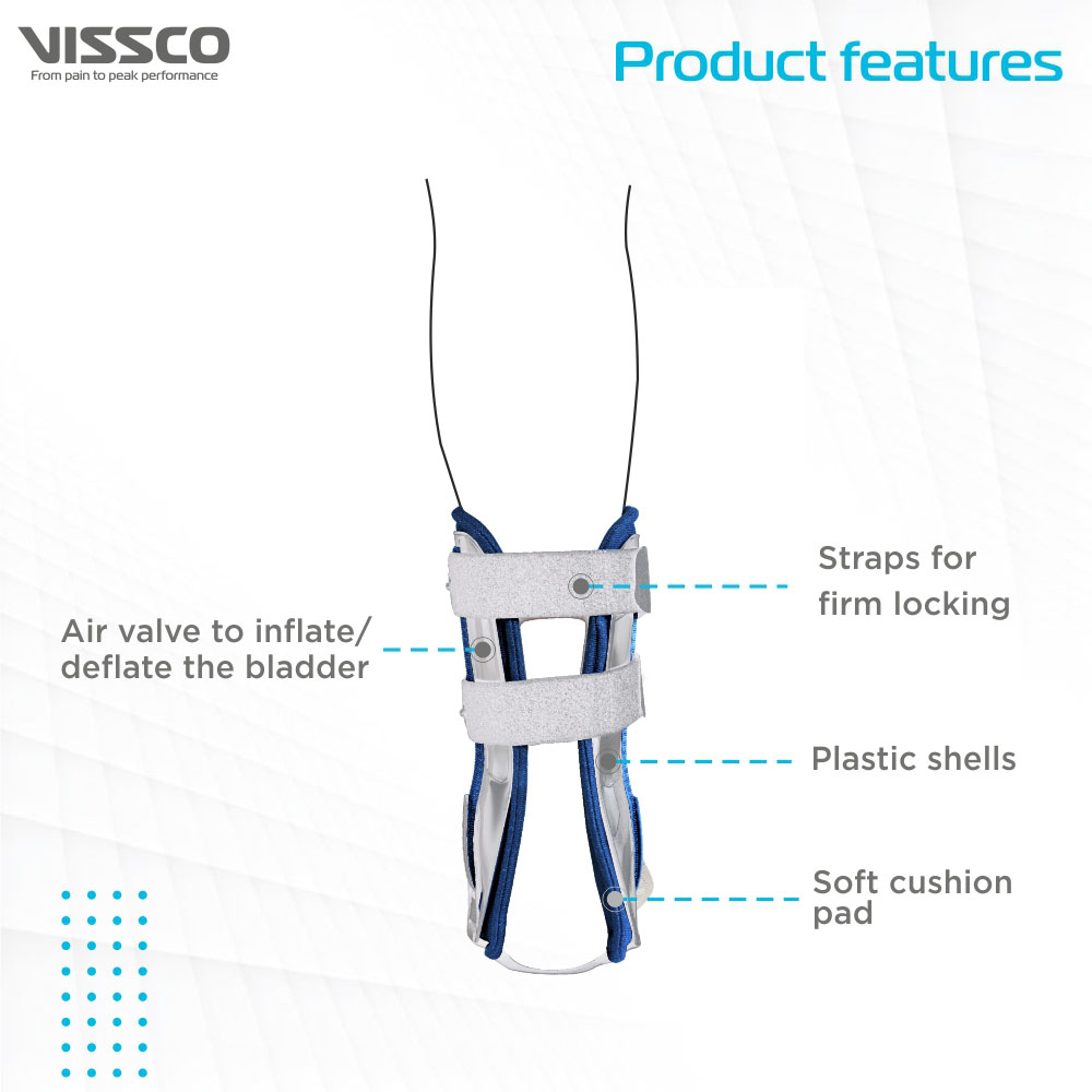 Scientifically designed to support the ankle and prevent injury. Improves ankle stability and provides support to prevent ankle injuries. The rigid padded contoured plastic shells give comfortable and optimum support to Ankle joint, Allows plantar flexion and dorsiflexion. Soft cushion inner linings protect against bony prominences and injured area other than providing comfort. Inflatable air bladder given on either side of the splint can be inflated and deflated as per need for better stability, pneumatic compression helps smooth blood flow to reduce pain and early recovery. Heel strap with Velcro help adjust height of the splint as per patient need and the product can be worn inside the shoe.